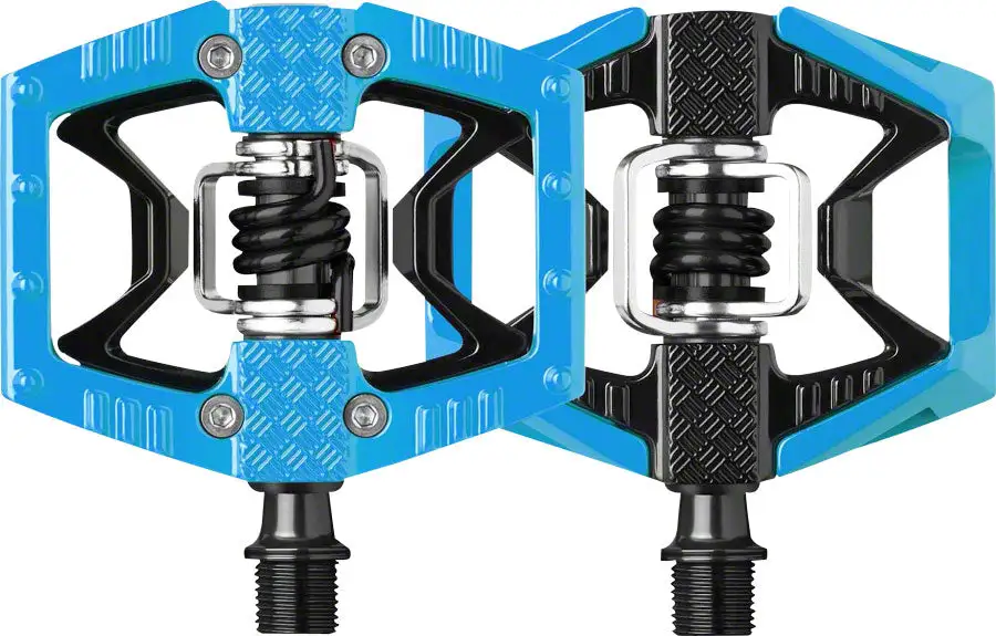 Hybrid pedal is flat on one side and clip-in on the other. The flat side features molded traction pads and pins for grip; the clip-in side has a diamond plate traction area.